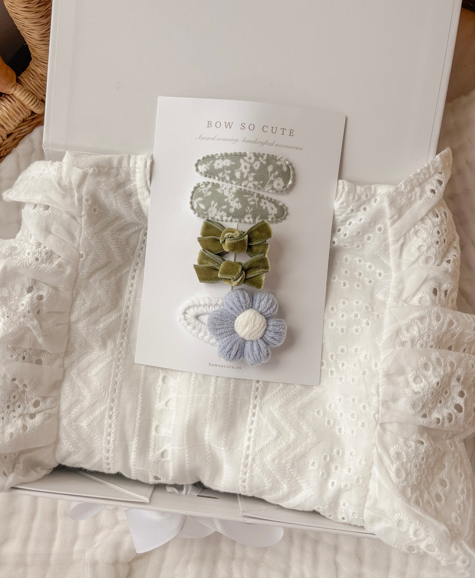 Bows & Clips: we recommend spot cleaning these accessories only when necessary. Use warm water on a damp cloth only, and leave to air dry. Never get any metal parts wet, as this will cause rust and discolouration. Store all pieces out of direct sunlight.