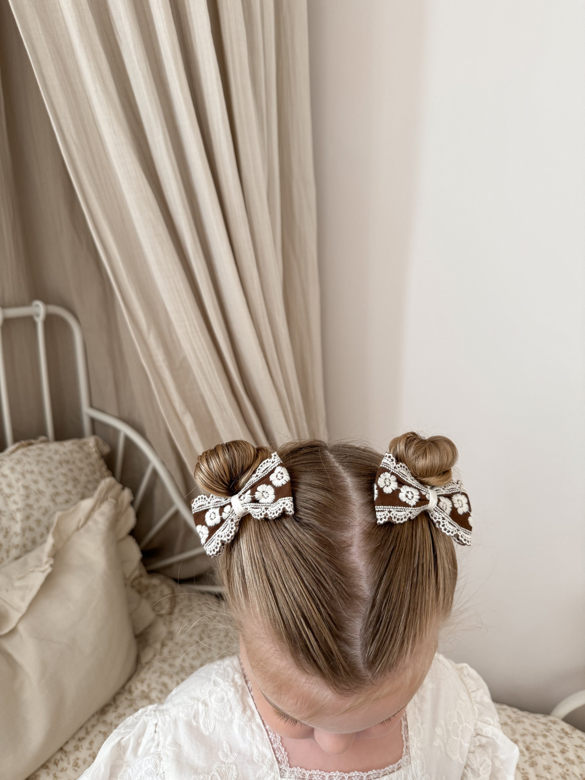 Our pigtail bows are sold in sets of 2. The bows are made on metal alligator clips, with one left facing and one right facing.