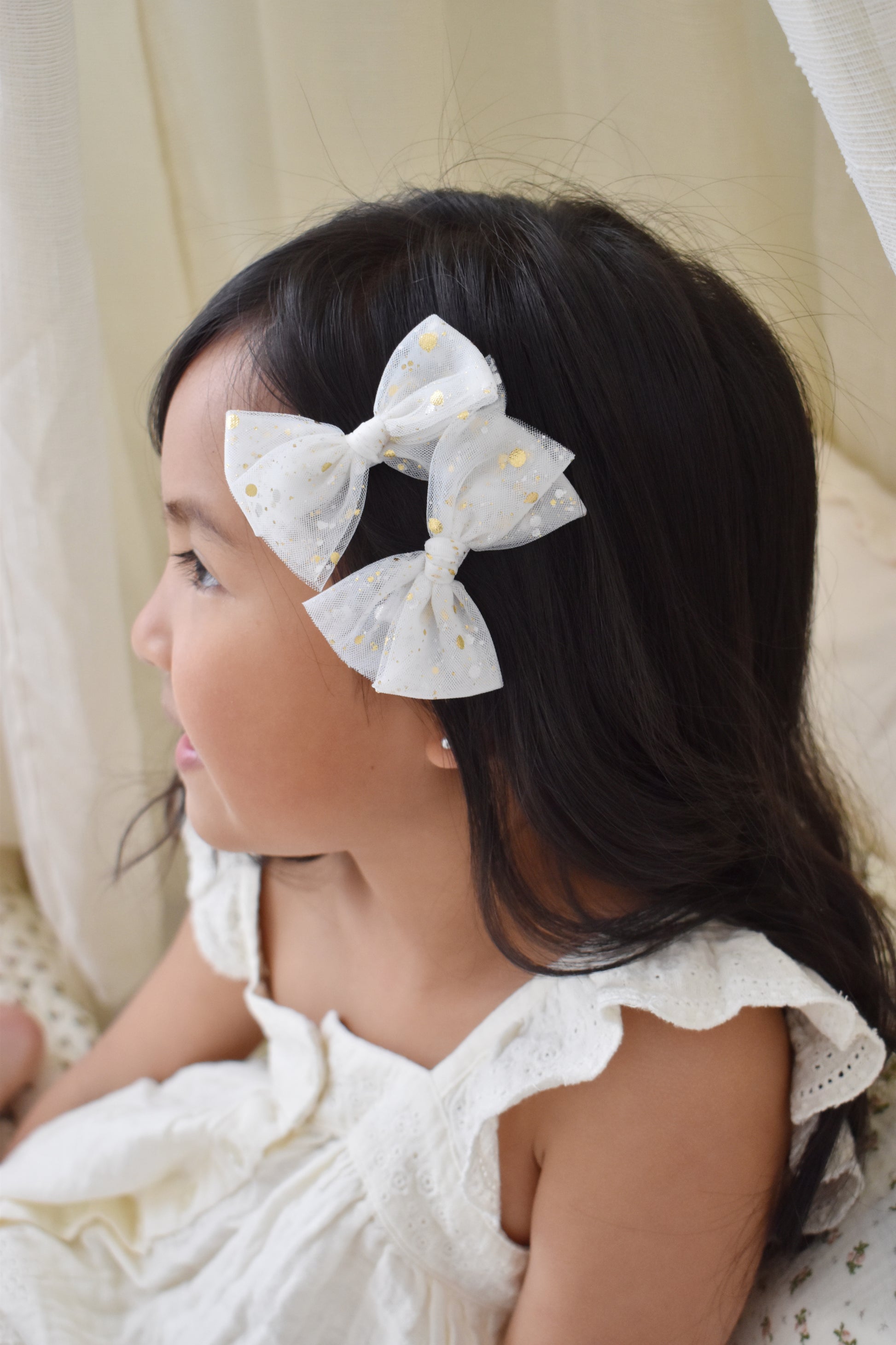 Our pigtail bows are sold in sets of 2. The bows are made on metal alligator clips, with one left facing and one right facing.