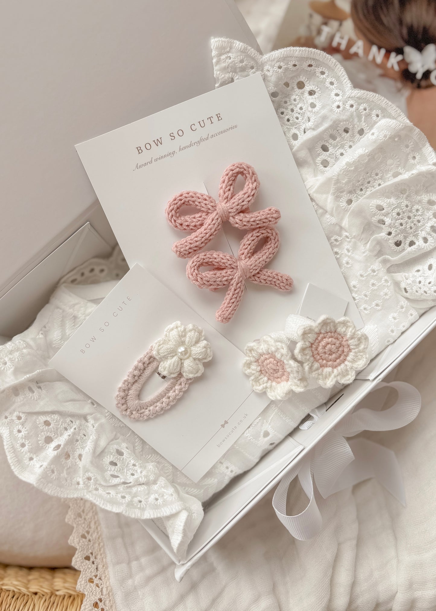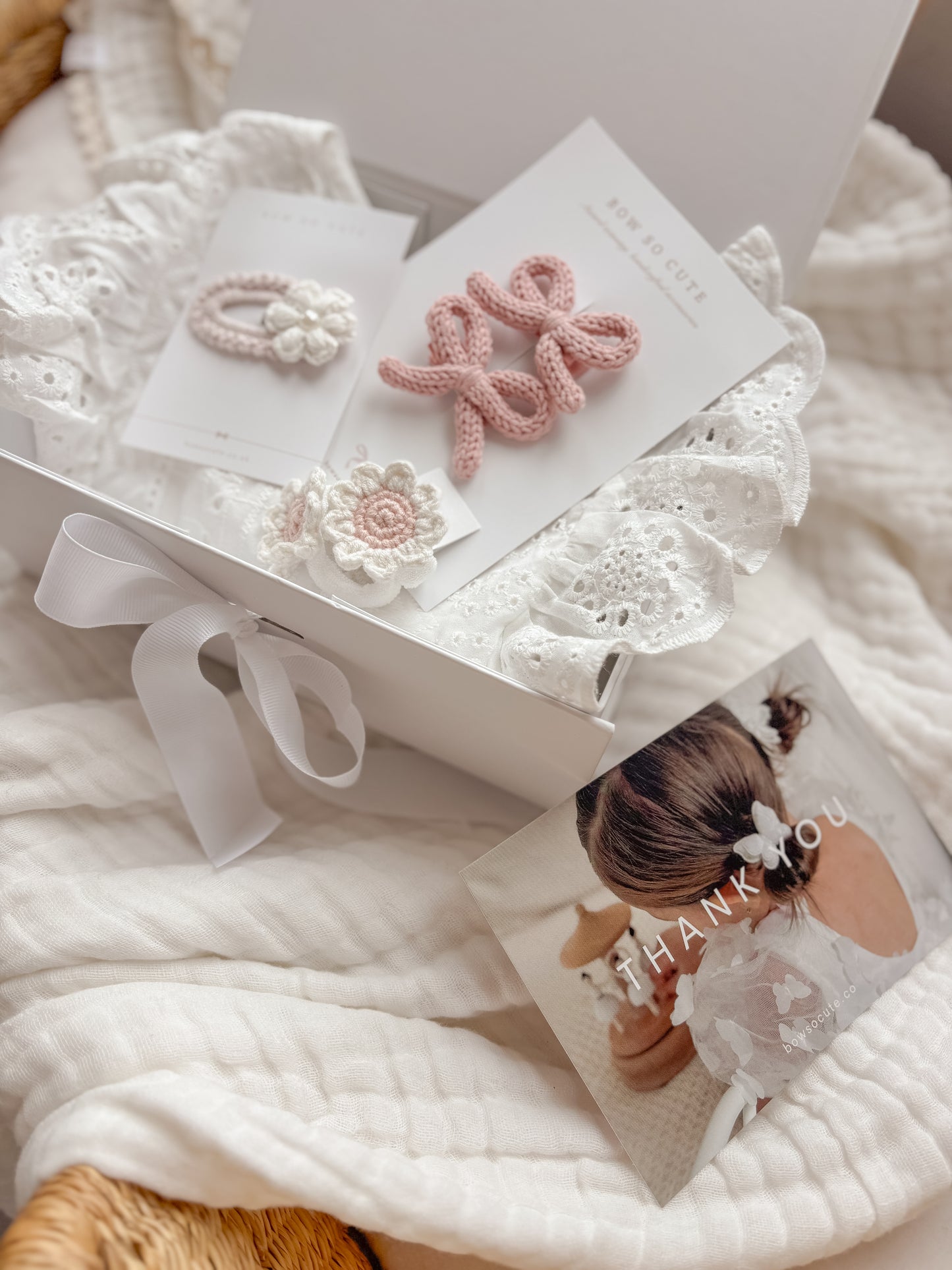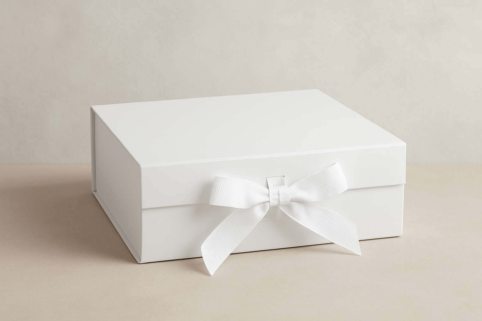 The perfect finishing touch for a thoughtful gift. Add a little extra magic to your order with our elegant white gift box, complete with a soft white ribbon tie. Made from sturdy, high-quality cardboard, this box is designed to protect and present your handmade hair accessories beautifully.